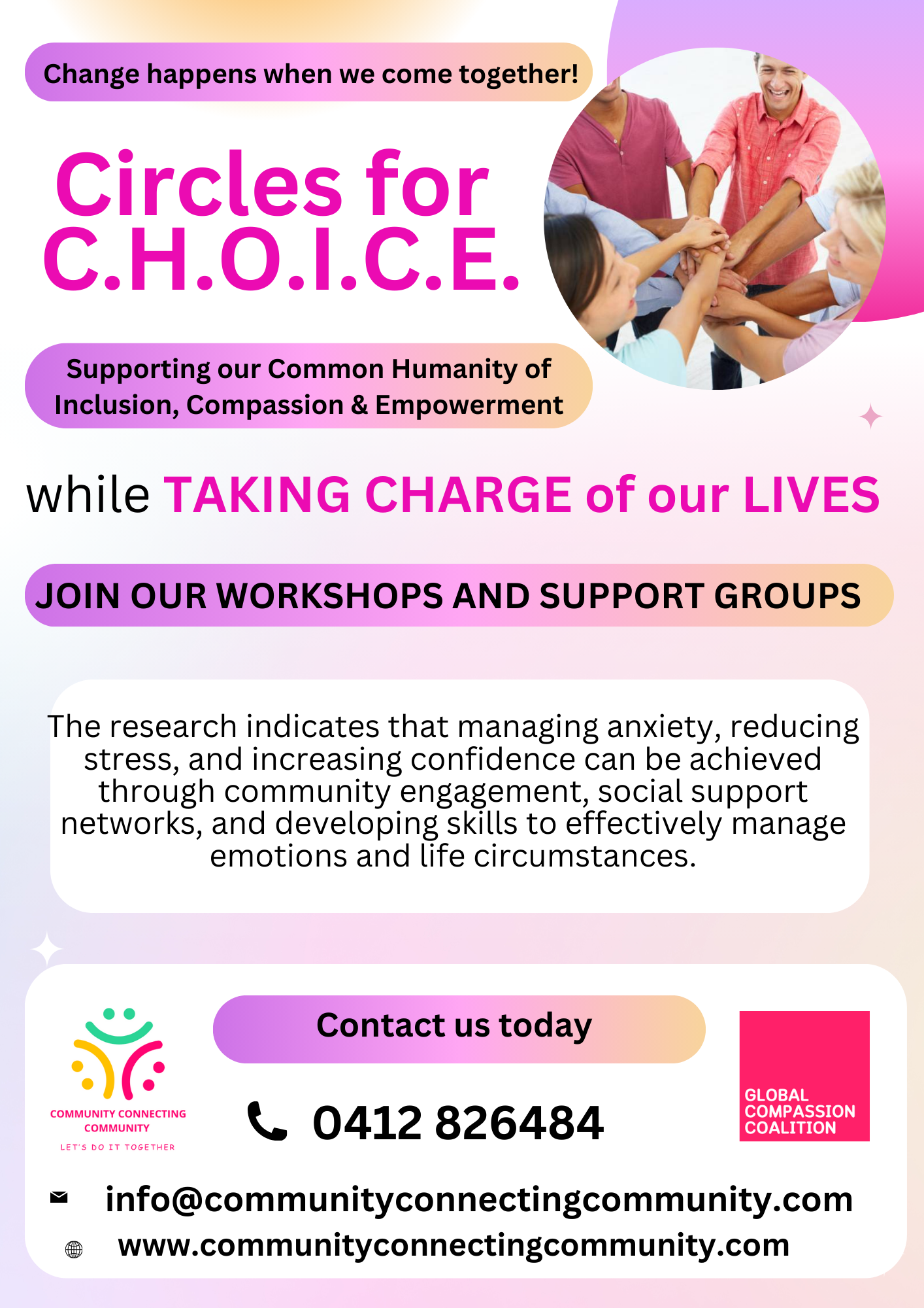 So, the topics we will be discussing during our C.H.O.I.C.E. Compassion Circles are aimed to help members of our communities work together to create opportunities and networks for social connections and dissolve the barriers to compassion.